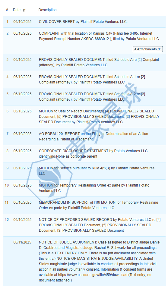 Potato Ventures LLC的维权案件编号25-cv-02312,由AVEK于2025年06月10日在美国堪萨斯州法院发起专利维权。